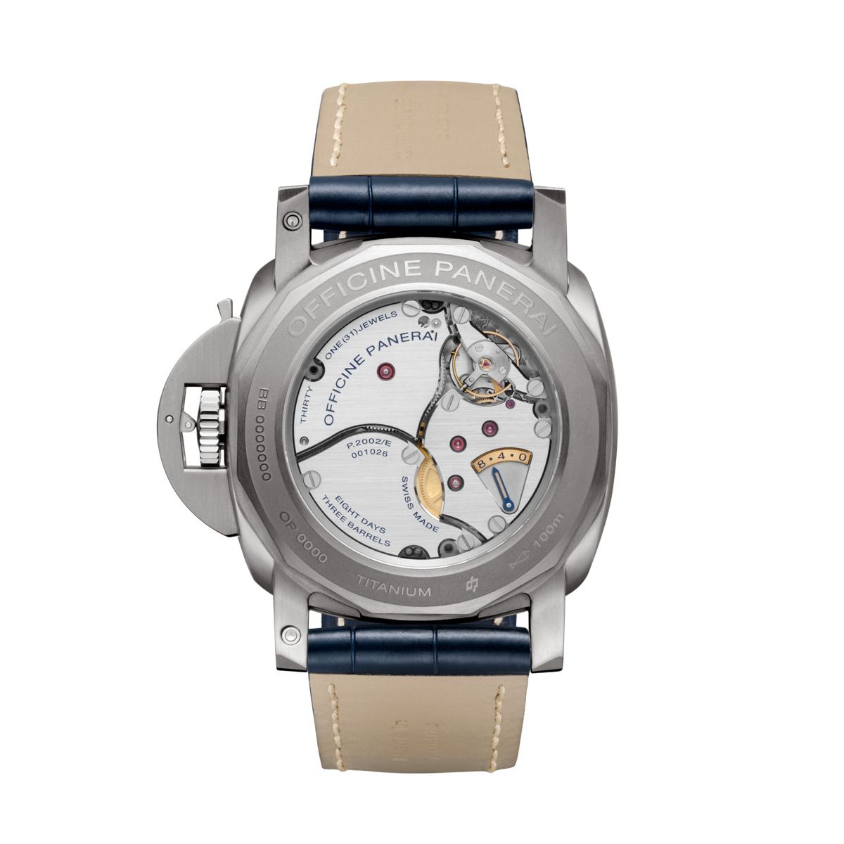 Hand-wound mechanical, P.2002/E calibre, 13 ¾ lignes, 8,30 mm thick, 31 jewels, 28,800 alternations/hour. KIF PARECHOC® anti-shock device. Power reserve 8 days. 328 components