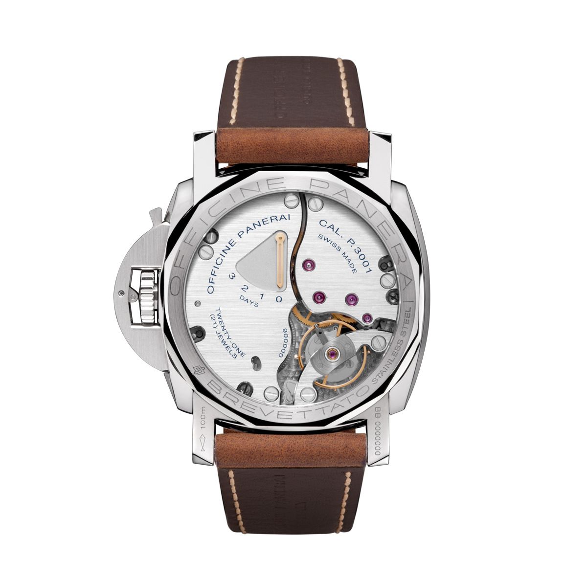 Hand-wound mechanical, P.3001 calibre, 16½ lignes, 6.3 mm thick, 21 jewels, Glucydur® balance, 21,600 alternations/hour. Incabloc® anti-shock device. Power reserve 3 days, two barrels. 213 components